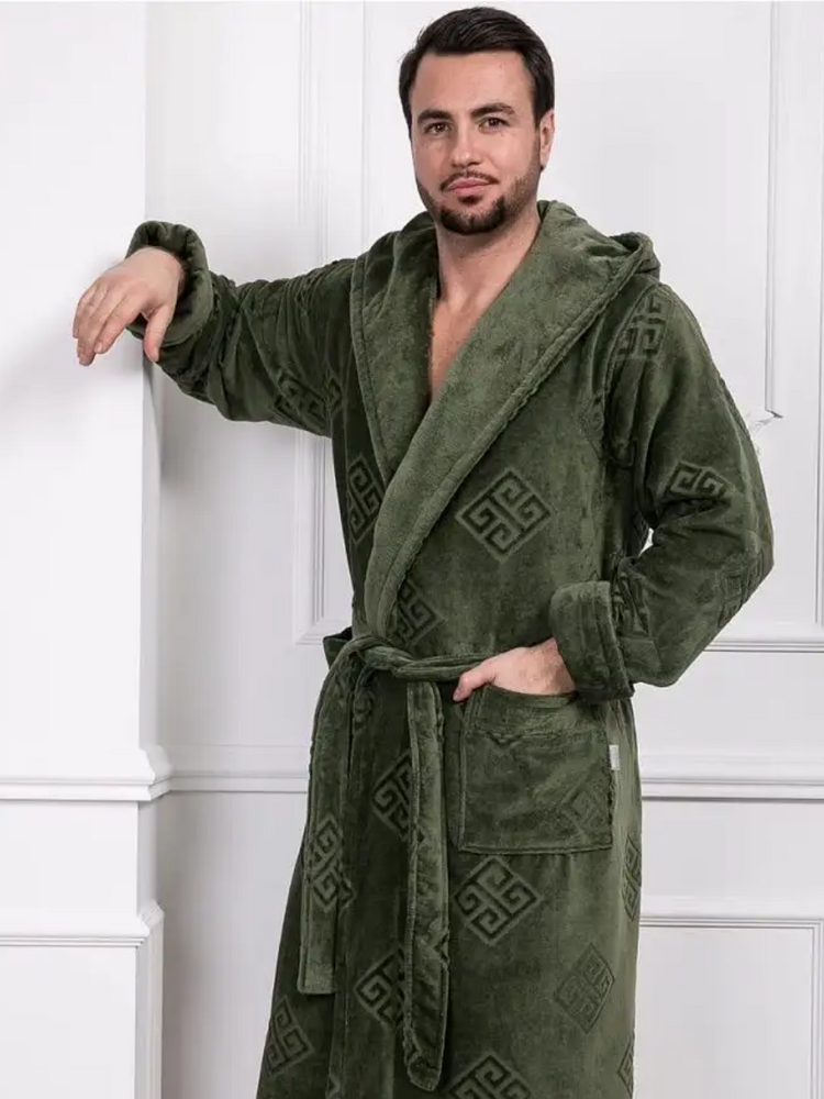Халат мужской махровый с капюшоном Hugo с текстурным жаккардом, хаки