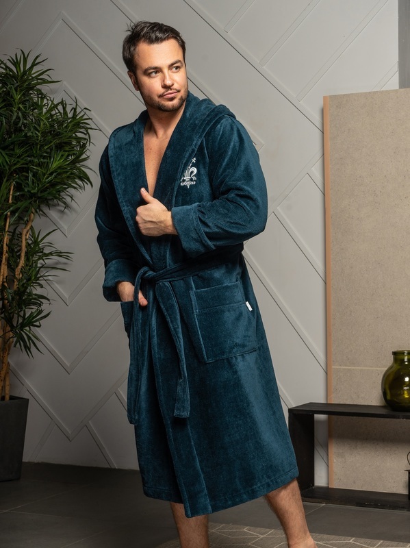 Мужской махровый халат с капюшоном (100% хлопок) "LOUIS", Морская волна