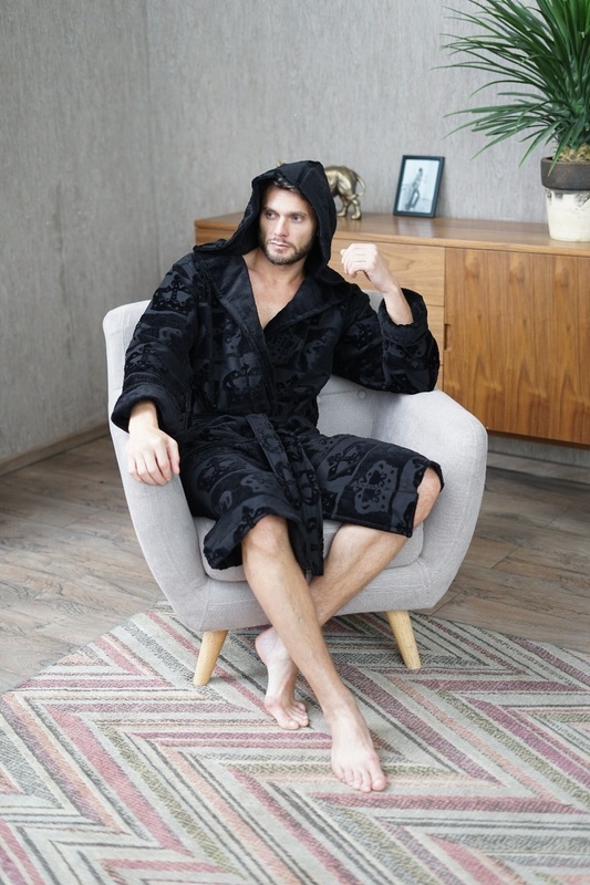 Элегантный и стильный махровый халат с капюшоном из плотной двухсторонней махровой ткани. Незабываемое ощущение мягкости, элегантный стиль и благородный глубокий цвет в сочетании с красивым жаккардовым рисунком по всему изделию.