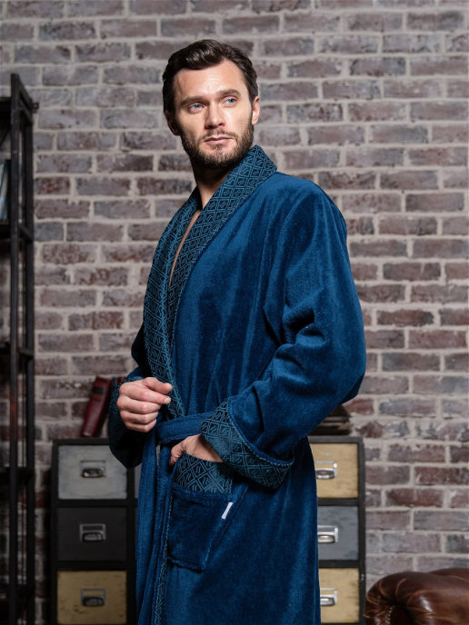Данная модель изготовлена из нитей высшего качества. Фактурная ткань с красивым жаккардовым рисунком по воротнику, рукавам и карманам привнесет торжественности и оригинальности в привычную атмосферу домашнего уюта. Элегантный и стильный халат смотрется шикарно, поэтому его по достоинству оценят все представителе сильного пола. Мы всегда используем в своих изделиях дорогие высококачественные материалы, поэтому данная модель выполнена из инновационной ткани TRIGA Хлопок: Внутренняя сторона ткани на основе хлопка, поэтому приятна тактильными ощущениями и натуральностью к телу. Лицевая сторона - велюр из микрофибры, придающий халату легкость и необычайную мягкость, что точно не оставит Вас равнодушным к данной моделе. Петельки в ткани надежно закреплены и не поддаются выдергиванию. Халат легко стирается, а также не требует глажки после стирки. Манжеты на рукавах отворачиваемые, регулируемые. Шлевки для пояса двухуровневые, для регулировки по росту.