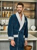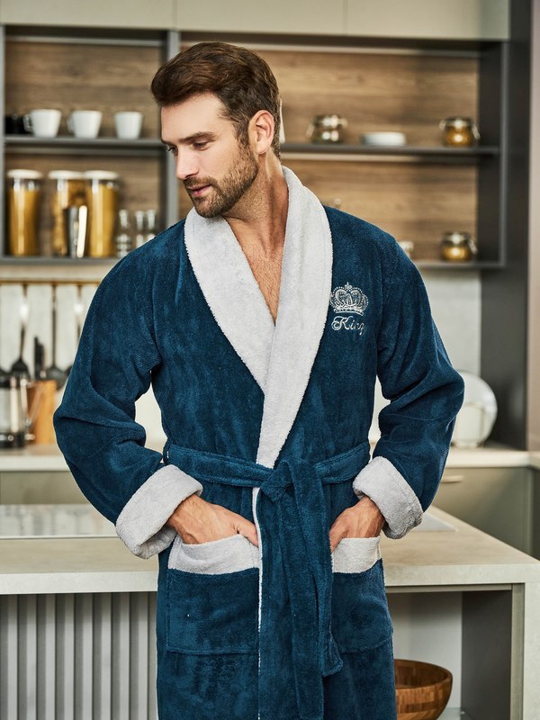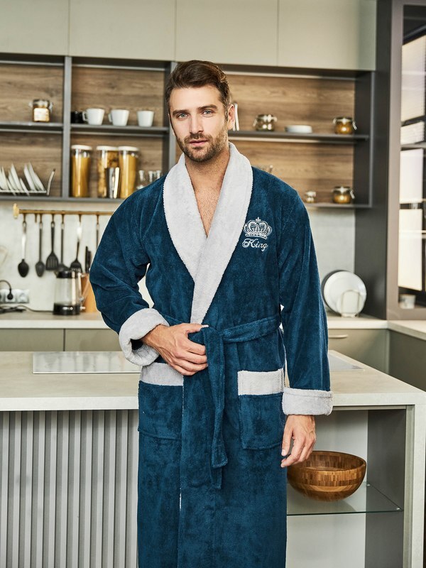 Предлагаем Вашему вниманию современную классическую мужскую модель халата "KING" с шалевым воротником. Элегантный и стильный халат смотрется шикарно, поэтому ее по достоинству оценят все представителе сильного пола. Мы всегда используем в своих изделиях дорогие высококачественные материалы, поэтому данная модель выполнена из инновационной ткани TRIGA Хлопок: Внутренняя сторона ткани на основе хлопка, поэтому приятна тактильными ощущениями и натуральностью к телу. Лицевая сторона - велюр из микрофибры, придающий халату легкость и необычайную мягкость, что точно не оставит Вас равнодушным к данной моделе. Петельки в ткани надежно закреплены и не поддаются выдергиванию. Халат легко стирается, а также не требует глажки после стирки. Манжеты на рукавах отворачиваемые, регулируемые.