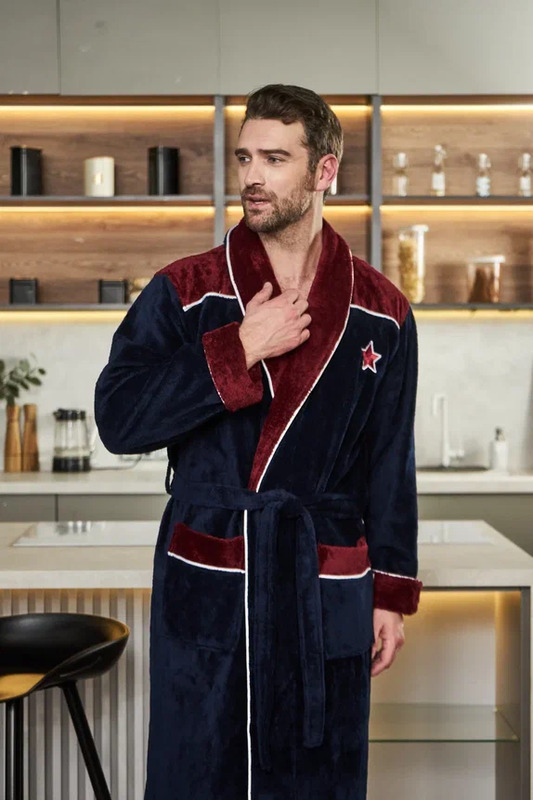 Данная модель изготовлена из нитей высшего качества. Фактурная ткань с красивым жаккардовым рисунком по воротнику, рукавам и карманам привнесет торжественности и оригинальности в привычную атмосферу домашнего уюта. Элегантный и стильный халат смотрется шикарно, поэтому его по достоинству оценят все представителе сильного пола. Мы всегда используем в своих изделиях дорогие высококачественные материалы, поэтому данная модель выполнена из инновационной ткани TRIGA Хлопок: Внутренняя сторона ткани на основе хлопка, поэтому приятна тактильными ощущениями и натуральностью к телу. Лицевая сторона - велюр из микрофибры, придающий халату легкость и необычайную мягкость, что точно не оставит Вас равнодушным к данной моделе. Петельки в ткани надежно закреплены и не поддаются выдергиванию. Халат легко стирается, а также не требует глажки после стирки. Манжеты на рукавах отворачиваемые, регулируемые. Шлевки для пояса двухуровневые, для регулировки по росту.