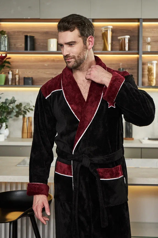 Данная модель изготовлена из нитей высшего качества. Фактурная ткань с красивым жаккардовым рисунком по воротнику, рукавам и карманам привнесет торжественности и оригинальности в привычную атмосферу домашнего уюта. Элегантный и стильный халат смотрется шикарно, поэтому его по достоинству оценят все представителе сильного пола. Мы всегда используем в своих изделиях дорогие высококачественные материалы, поэтому данная модель выполнена из инновационной ткани TRIGA Хлопок: Внутренняя сторона ткани на основе хлопка, поэтому приятна тактильными ощущениями и натуральностью к телу. Лицевая сторона - велюр из микрофибры, придающий халату легкость и необычайную мягкость, что точно не оставит Вас равнодушным к данной моделе. Петельки в ткани надежно закреплены и не поддаются выдергиванию. Халат легко стирается, а также не требует глажки после стирки. Манжеты на рукавах отворачиваемые, регулируемые. Шлевки для пояса двухуровневые, для регулировки по росту.