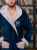 Мужской махровый халат KING, длинный с капюшоном, хлопок 100%, на груди вышивка "Корона", Морская волна