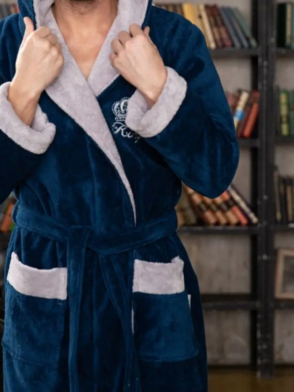 Предлагаем Вашему вниманию современную классическую мужскую модель халата "KING" с капюшоном. Контрастная отделка по капюшону, Элегантный и стильный халат смотрется шикарно, поэтому ее по достоинству оценят все представителе сильного пола. Мы всегда используем в своих изделиях дорогие высококачественные материалы, поэтому данная модель выполнена из инновационной ткани TRIGA Хлопок: Внутренняя сторона ткани на основе хлопка, поэтому приятна тактильными ощущениями и натуральностью к телу. Лицевая сторона - велюр из микрофибры, придающий халату легкость и необычайную мягкость, что точно не оставит Вас равнодушным к данной моделе. Петельки в ткани надежно закреплены и не поддаются выдергиванию. Халат легко стирается, а также не требует глажки после стирки. Манжеты на рукавах отворачиваемые, регулируемые. Шлевки для пояса двухуровневые, для регулировки по росту. Карманы накладные, глубокие.