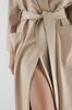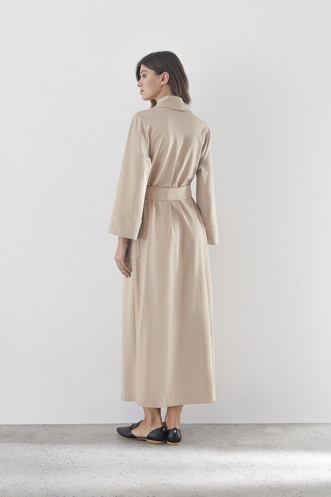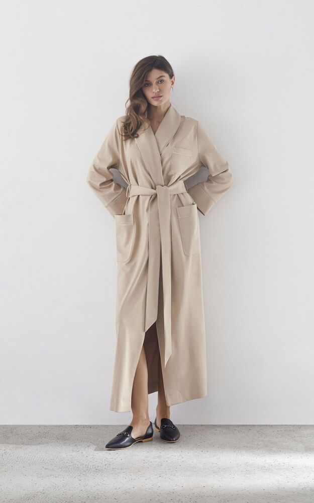 Эстетика халата в стиле old money противопоставляется быстрой моде, подчеркивая главные черты стиля - утонченность, элегантность и комфорт. Для создания лаконичного халата в пол на запахе было выбрано плотное вискозное полотно с гладким плетением, которое отлично держит форму и придает изделию особый статусный вид. Сдержанный цвет подчеркивается строгими геометричными формами - акцентными шалевыми лацканами, широкими манжетами, гипертрофированно увеличенными карманами и тонкими атласными кантами. Широкий пояс-лента из основного полотна подчеркивает силуэт, акцентирует талию и регулирует глубину запаха.