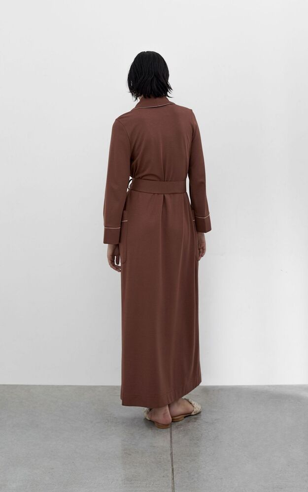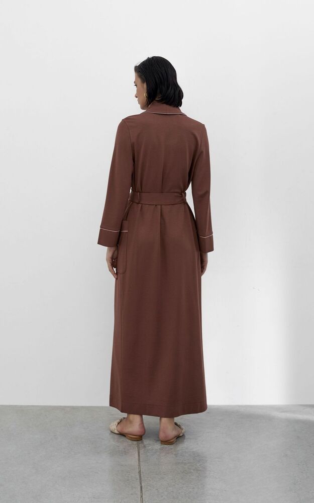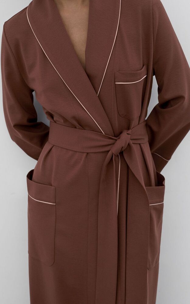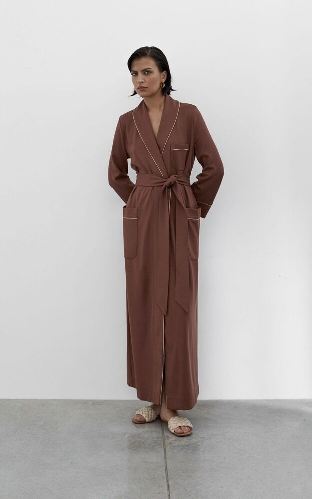 Эстетика халата в стиле old money противопоставляется быстрой моде, подчеркивая главные черты стиля - утонченность, элегантность и комфорт. Для создания лаконичного халата в пол на запахе было выбрано плотное вискозное полотно с гладким плетением, которое отлично держит форму и придает изделию особый статусный вид. Сдержанный цвет подчеркивается строгими геометричными формами - акцентными шалевыми лацканами, широкими манжетами, гипертрофированно увеличенными карманами и тонкими атласными кантами. Широкий пояс-лента из основного полотна подчеркивает силуэт, акцентирует талию и регулирует глубину запаха.