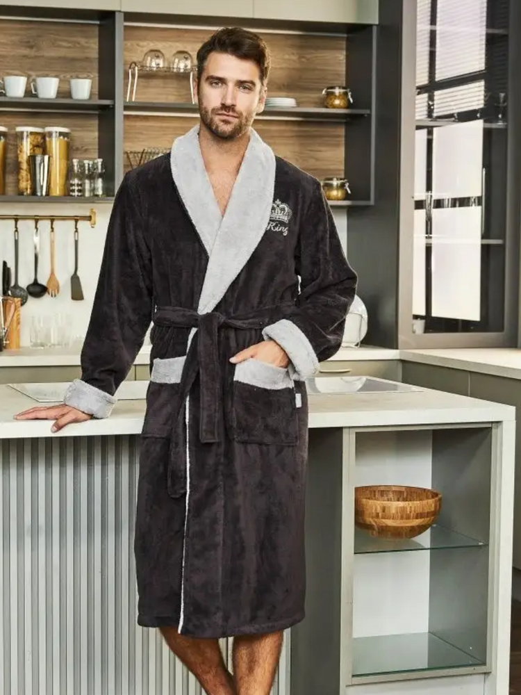 Мужской махровый халат KING, воротник шалька, хлопок 100%, на груди вышивка "Корона", Антрацит