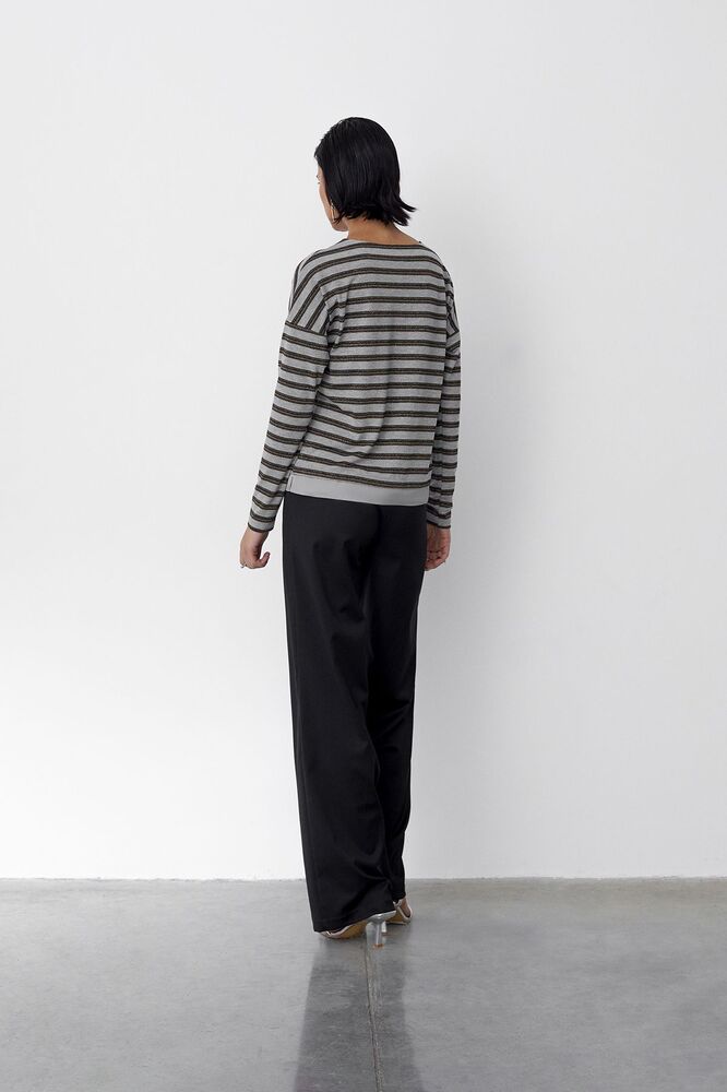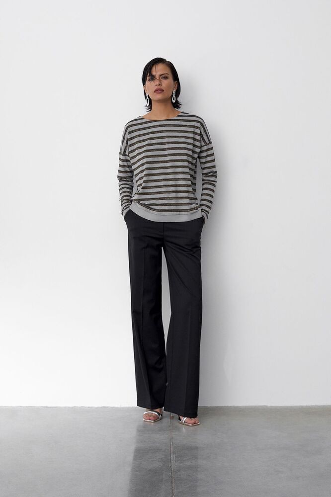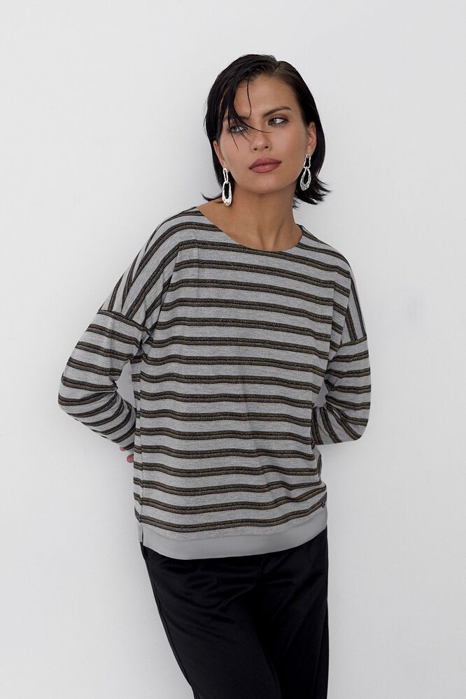 Лонгслив в полоску, выполненный из комбинации блестящего плотного сатина в цвете серебряный металлик и тонкой натуральной вискозы, переводит представление о базовом гардеробе на новый уровень. Лаконичный дизайн делает эту модель универсальной - лонгслив можно стилизовать как для кэжуал образа с базовыми джинсами, так и для особого случая с элегантными брюками. Нейтральный рисунок с вплетением сияющих люрексных нитей и прямой расслабленный силуэт с со спущенной линией плеча - вневременная классика, долго прослужащая вашему гардеробу.