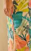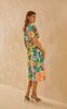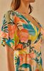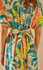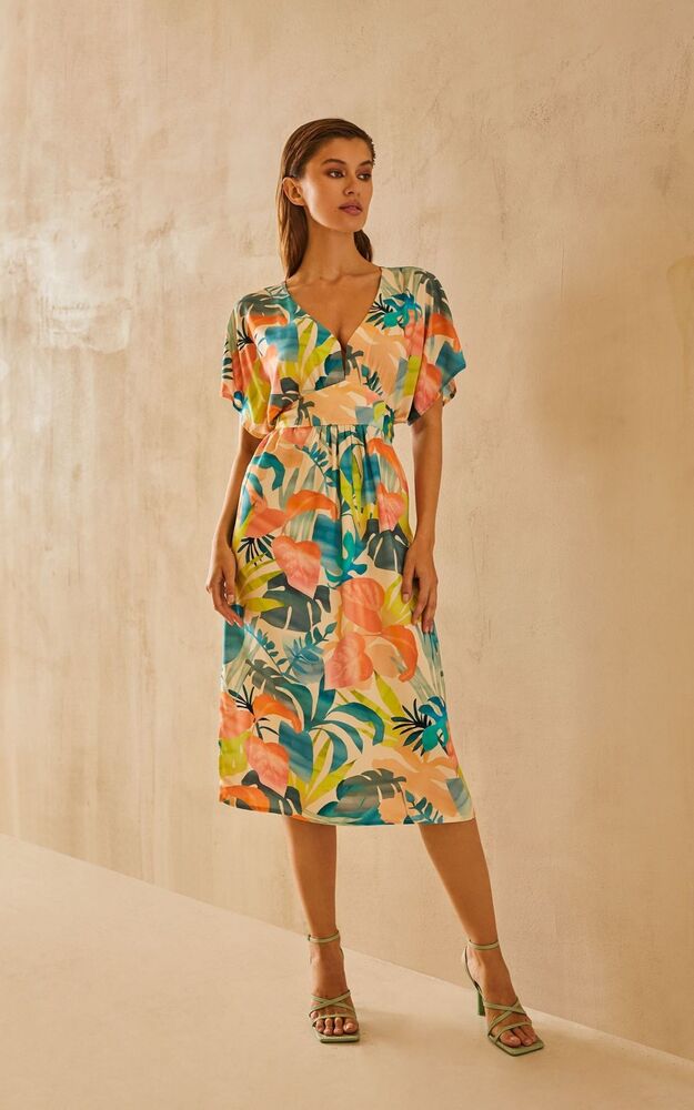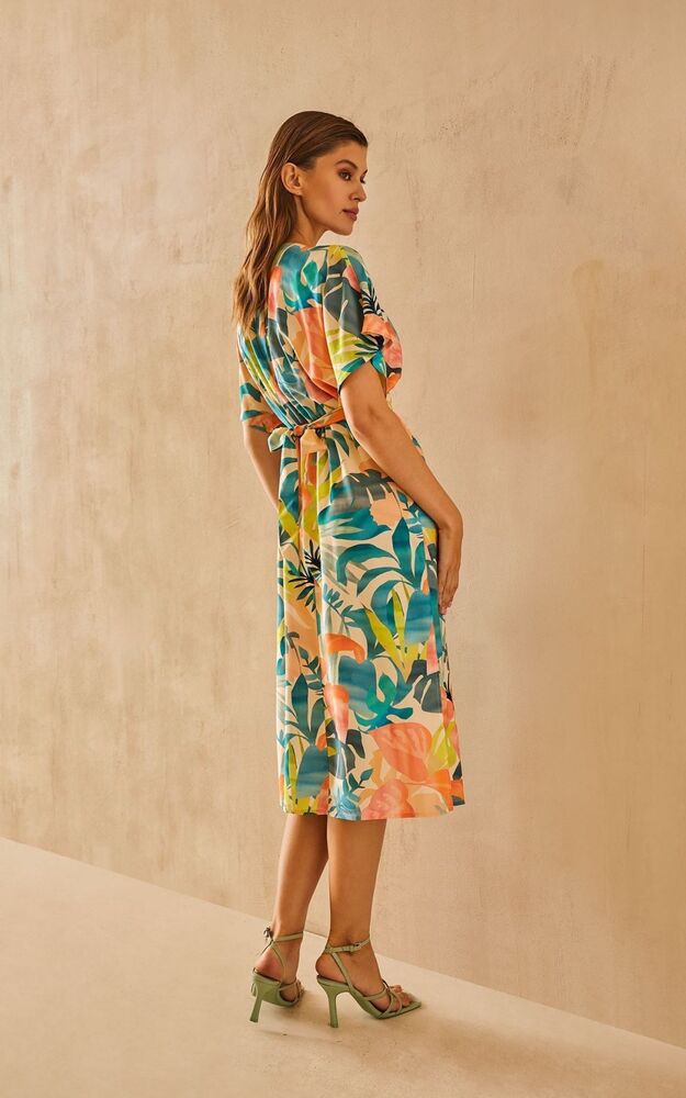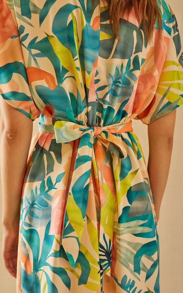 Лаконичному крою невесомого платья противопоставлены нарочито гипертрофированные яркие тропические листья, которые распустились на кремовом полотне. Вточная фигурная деталь пояса элегантно формирует А-образный силуэт и регулируется в зависимости от пожелания - можно завязать тугим бантом, максимально акцентируя внимание на талии или ослабить ленты, отдавая предпочтение более расслабленному образу. Модель оформлена V-образным вырезом, подчеркивающим естественную красоту ключиц, глубокими драпирующими складками по талии, придающими воздушность и свободными рукавами, деликатно прикрывающими плечи. За счет легкой 100% вискозы, которая защищает от ультрафиолетовых лучей, поддерживает оптимальную температуру тела и хорошо пропускает воздух, платье идеально подойдёт для прогулок по морскому берегу даже в самый знойный день.