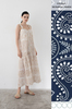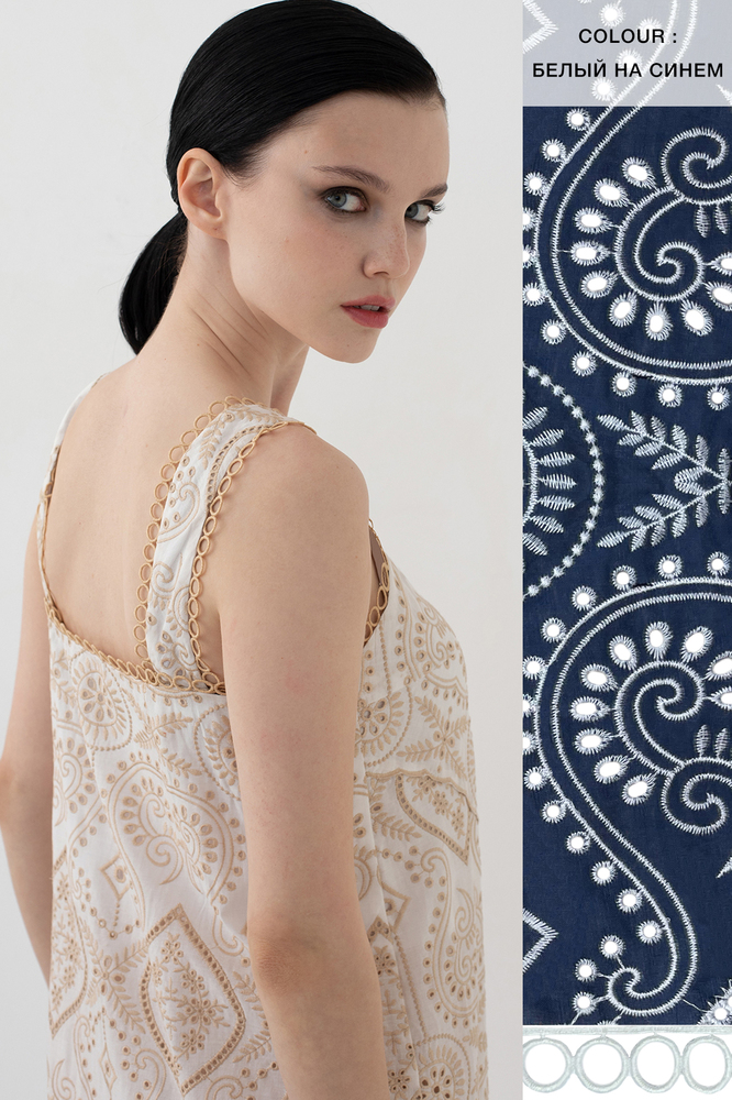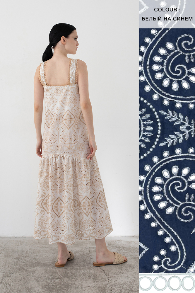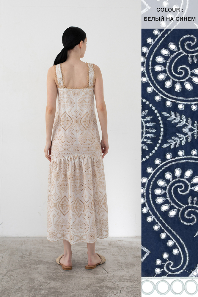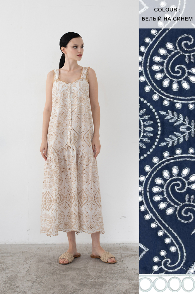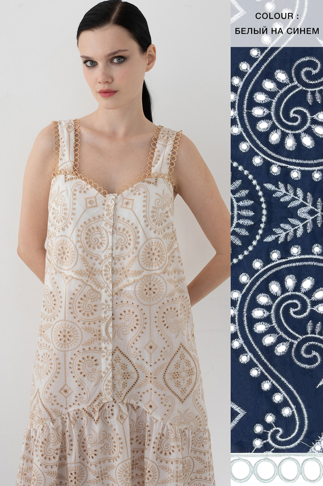 Сарафан скульптурного кроя с широкими бретелями выполнен из 100% хлопкового полотна, украшенного флористической вышивкой в технике broderie anglaise нитями песочного оттенка. Узору вторит декоративная тесьма, обтачивающая бретели и корсетный вырез декольте. Пышный волан расклешенной юбки с фигурным срезом делает образ особенно романтичным. Модель застегивается на длинный ряд пуговиц по отрезной планке. За счет базовых цветов и минималистичного силуэта сарафан будет сочетаться как с расслабленными плетеными сабо, так и с босоножками на каблуке.