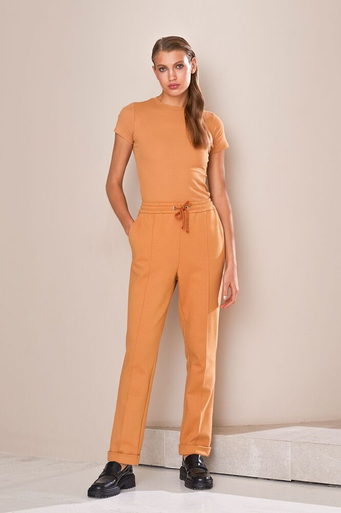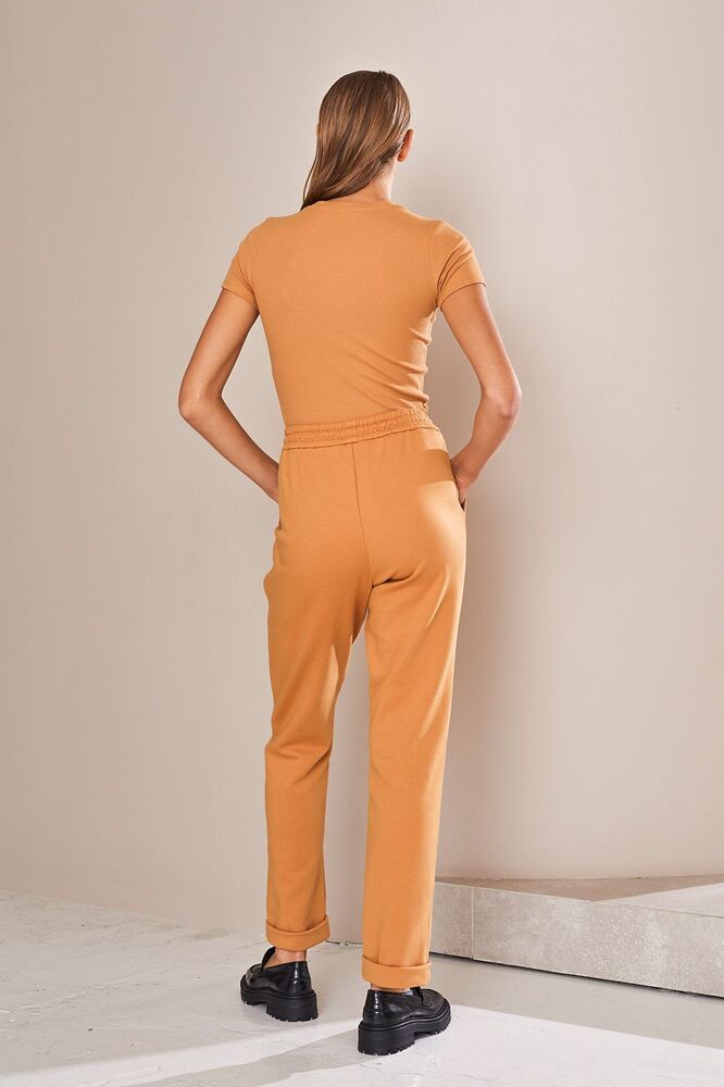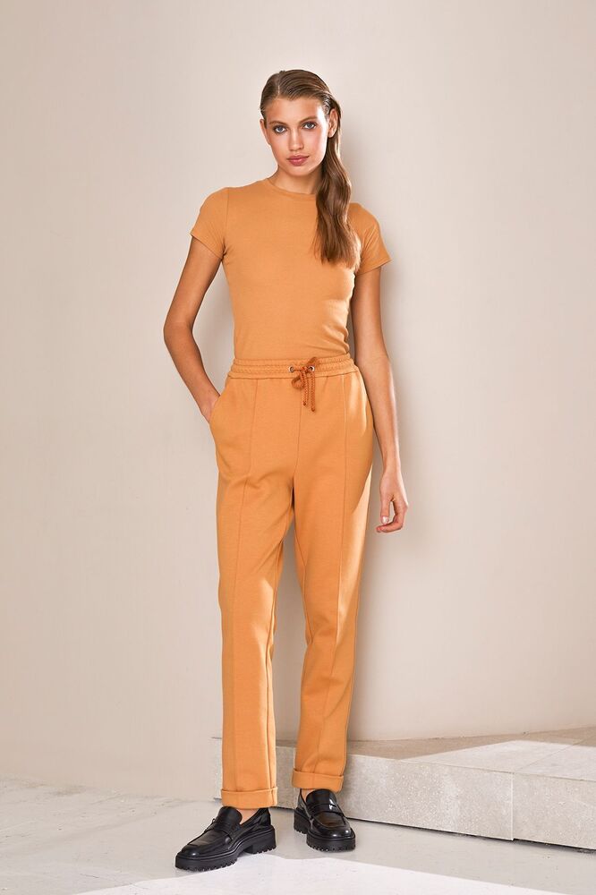 Базовая женская футболка прямого кроя бледно-золотого цвета. Свободная посадка, удобно носить навыпуск или заправлять. Выполнена из плотного и мягкого хлопкового полотна приятного к телу. Модель с коротким рукавом и округлым вырезом, отделанным кантом. Универсальная вещь в гардеробе, которая поможет создать офисный, спортивный или романтичный образ.